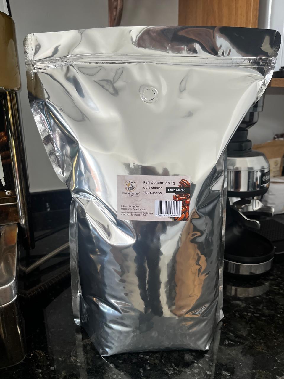 Pacote de refil de café arábica em grãos com 2,5 kg sem rótulo.